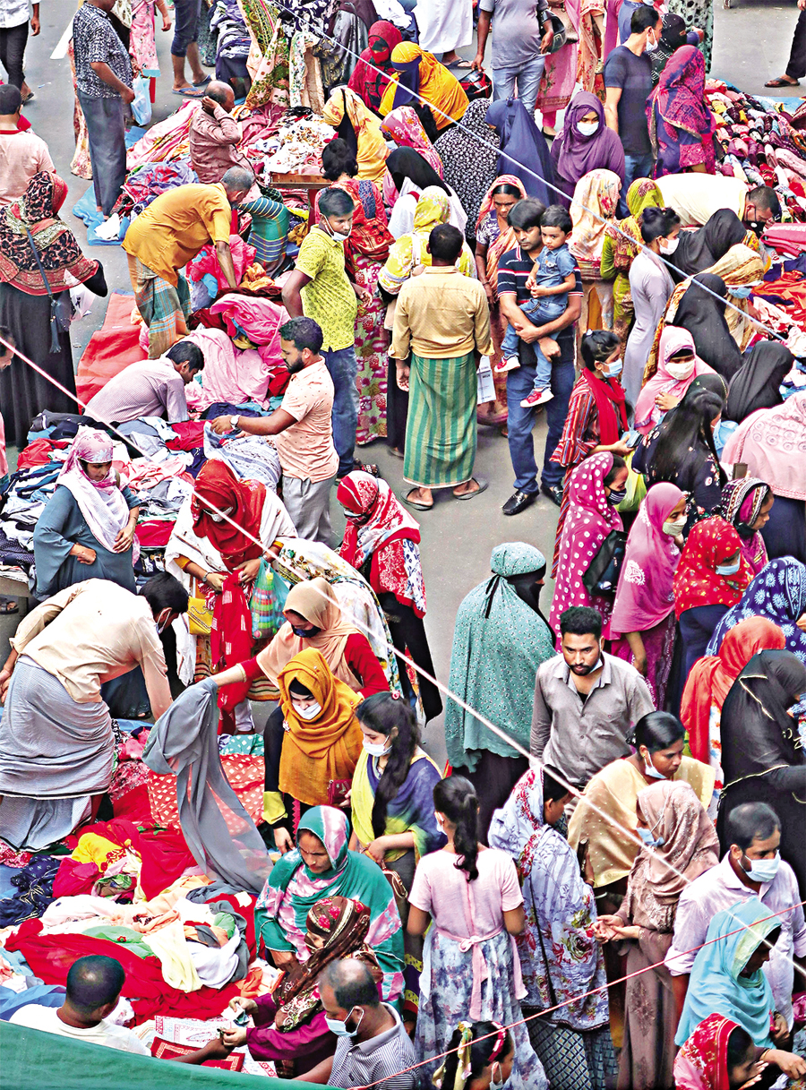People are busy buying stuff from a holiday market in front of the Motijheel Ideal School and College in the city on Friday, while Covid safety rules are simply ignored — FE photo by Shafiqul Alam