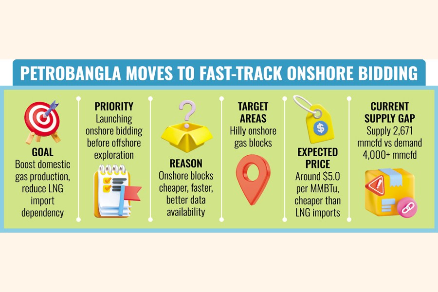 State-run Petrobangla has prioritised launching an onshore bidding round ahead of an offshore one to ramp up the country's overall natural gas output from local fields.