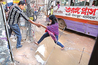 A pedestrian assists another in crossing a patch of water on the main road at Mouchak in the capital on Tuesday. The slow pace of work on a flyover and an ineffective sewerage system have long been causing serious inconveniences to the commuters of Mogbaz