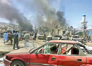 A view of the suicide attack scene at a busy market in Urgun, Paktika in south-eastern Afghanistan Tuesday that killed at least 25 people. Story on Page-14 — AFP
