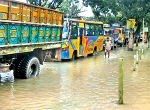 Vehicles remained standstill on a waterlogged road at the Hili land-port in Dinajpur on Tuesday, following spells of downpour during the last few days that hampered import-export activities through it. — Focus Bangla