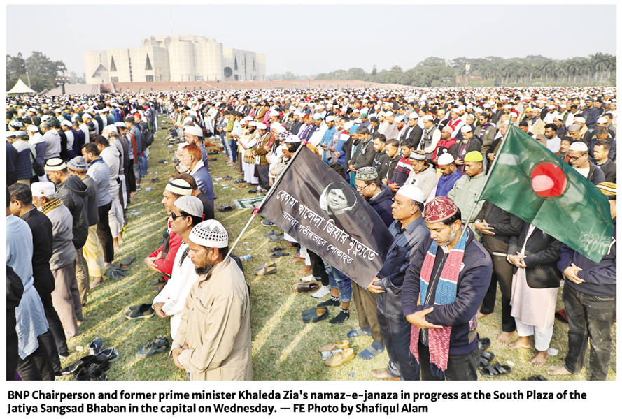 Chief Adviser Prof Muhammad Yunus and BNP acting chairman Tarique Rahman, along with the chief Justice, advisers of the interim government, the chiefs of army, naval and air staff, foreign diplomats, as well as leaders of different political parties, participate in the namaz-e-janaza of BNP chairperson and former prime minister Begum Khaleda Zia at Manik Mia Avenue in Dhaka on Wednesday. — PID