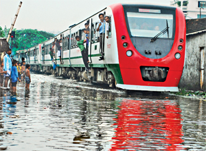 A train plying the submerged railway-line at Gendaria in Old Dhaka following a spell of downpour that disrupted city life Wednesday. — FE Photo