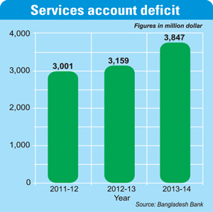 Bangladesh's services account deficit gaped to US$ 3.8 billion in the fiscal year (FY) 2013-14, the largest at least in the last three fiscal years, mainly due to higher payments on account of international transportation.