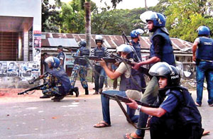 Policemen in action during fierce clashes with Jamaat-Shibir activists at Companyganj in Noakhali Saturday that left three people killed and many more injured. — Focus Bangla
