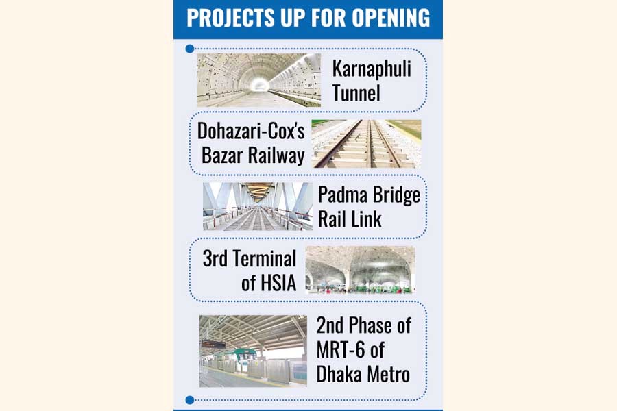 On the list are Karnaphuli River tunnel, Dohazari-Cox's Bazar rail route, Padma Bridge rail link, the third terminal of Hazrat Shahjalal International Airport and the second phase of the MRT-6 line of Dhaka metro rail.