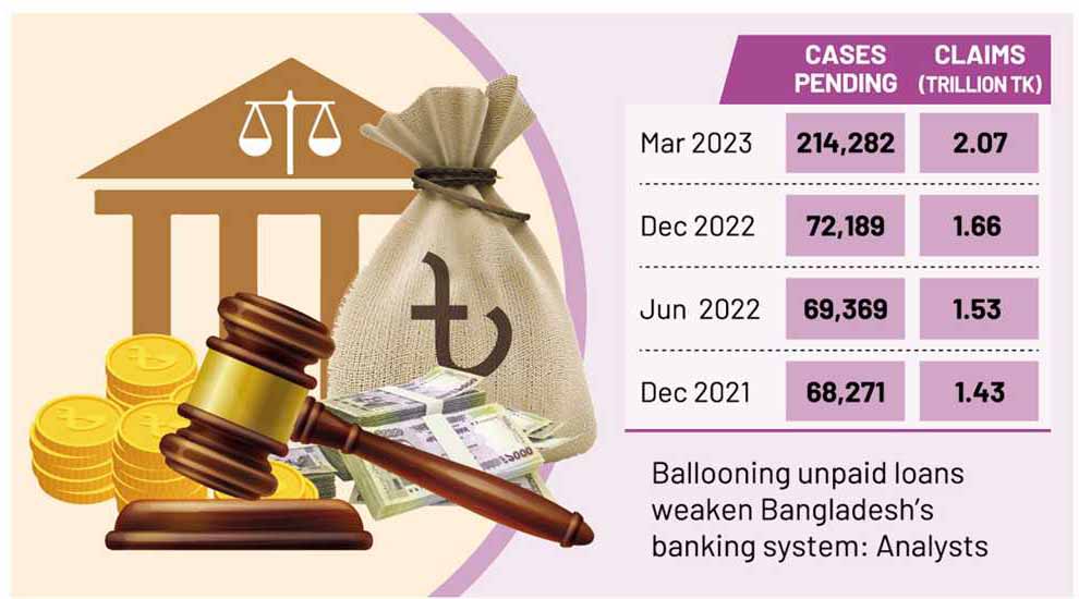 The total number of such cases with Artha Rin Adalats (money loan courts) had risen to 214,282 until then, and the aggregate claims stood at around Tk 2.07 trillion.