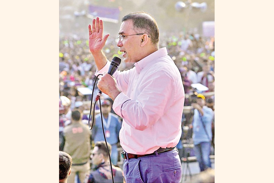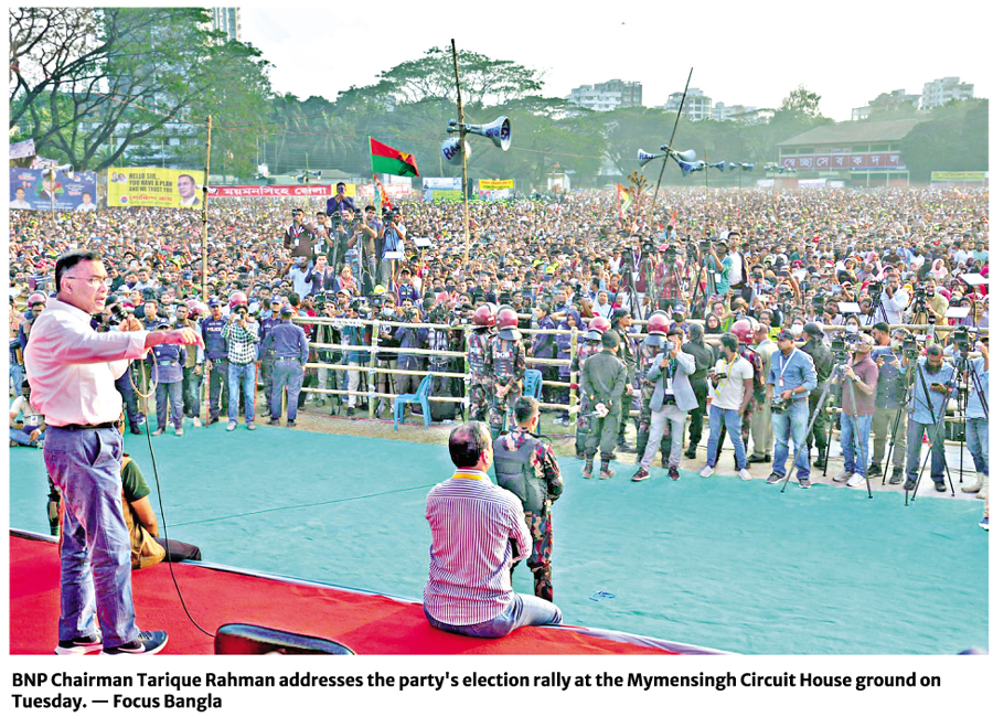 The BNP chief sought a pledge from the crowd to guard polling stations. When supporters responded loudly with 'Yes', Tarique replied, "Inshallah."