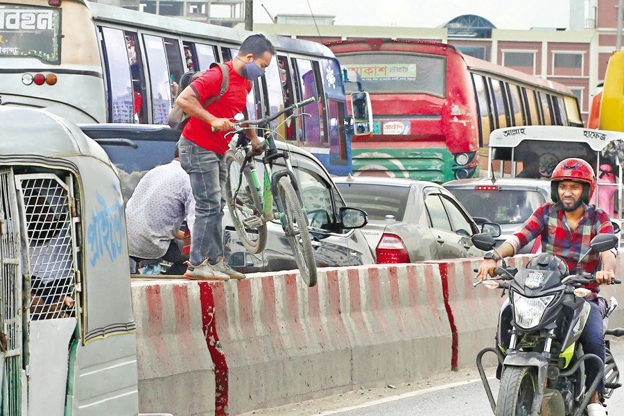 Stuck in a seemingly never-ending traffic jam, this person with his bicycle is crossing a road divider in a desperate bid to take the wrong lane for reaching his destination. The photo was taken on the Buriganga Bridge at Babu Bazar in Dhaka on Tuesday — FE photo by KAZ Sumon