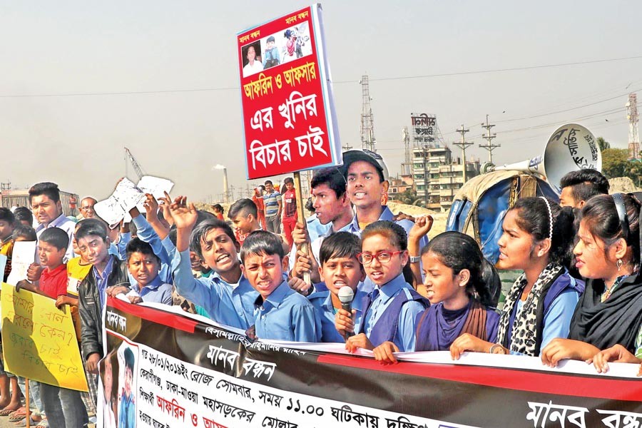 KERANIGANJ, Jan 31 (UNB): Students of different schools and colleges formed a human chain and blocked Dhaka-Mawa highway at Rajendrapur in South Keraniganj here on Thursday, demanding immediate arrest and capital punishment of the truck driver responsible for the death of two siblings in a road accident.