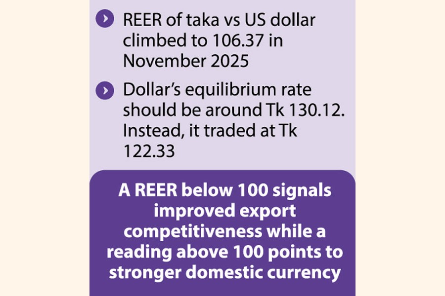 Bangladesh Bank's latest data show the real effective exchange rate (REER) of the taka against the globally losing US dollar climbed to 106.37 in November, remaining almost same with October figure. This REER rise signals that the local currency remains stronger than its equilibrium level.