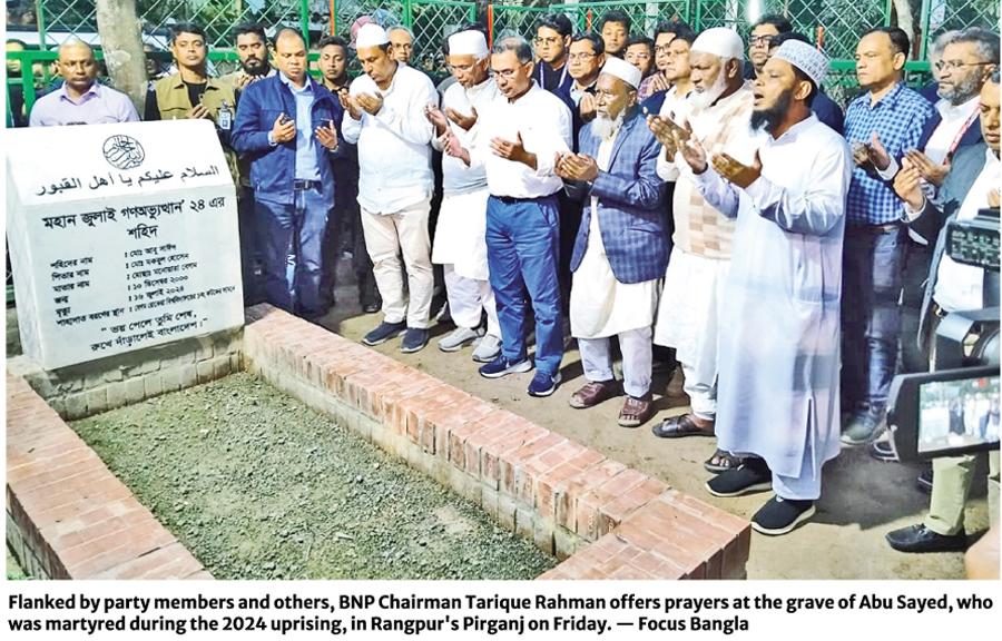 At around 5:55pm, Tarique Rahman went to Babanpur Jafarpara village in Pirganj upazila, where Shaheed Abu Sayed, the first martyr of the July 2024 Uprising, is buried.