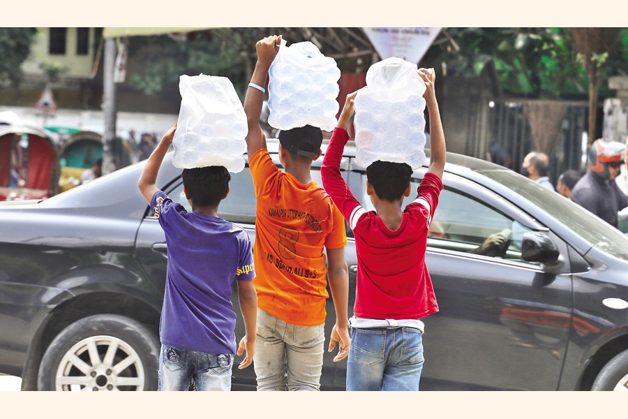 These kids are supposed to be at school. Instead, they are selling water bottles to support their family financially. The photo was taken in Dhaka's Shahbagh area marking the World Against Child Labour Day-2023 to be observed today (12 June) — FE photo by Shafiqul Alam