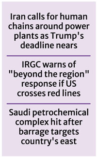 TEHRAN, Apr 7 (AP): Iranian officials on Tuesday urged young people to form human chains to protect power plants, as US President Donald Trump warned that a "whole civilization will die tonight" if Tehran does not meet his latest deadline to agree to a deal that includes reopening the Strait of Hormuz.