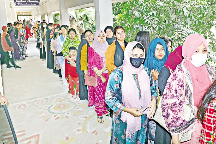 Voters, mostly young women, queue at the Khilgaon Model College centre in the capital to cast their ballots Thursday. — Shafiqul Alam
