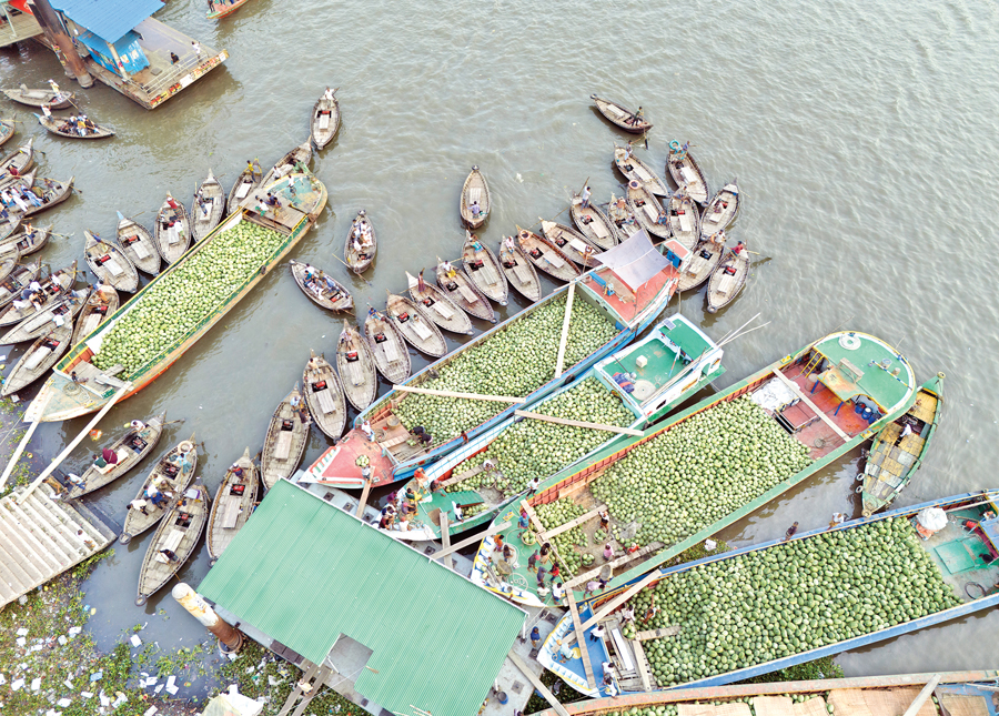 Watermelons are unloaded from boats at Badamtoli Ghat on the Buriganga River in the capital on Sunday, as