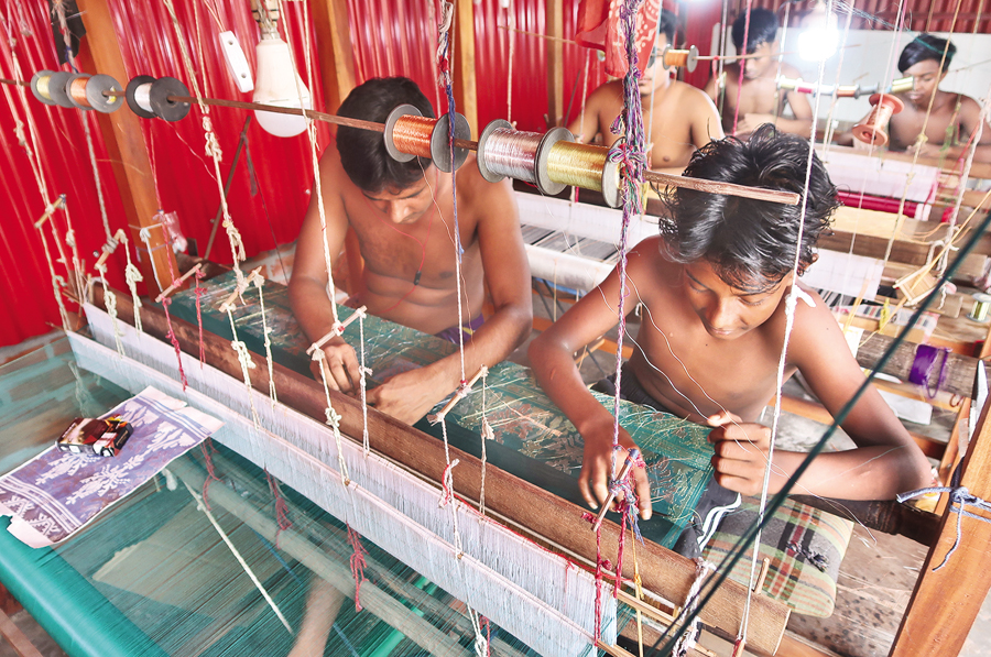Workers meticulously weave Jamdani saris on traditional handlooms, showcasing Bangladesh's