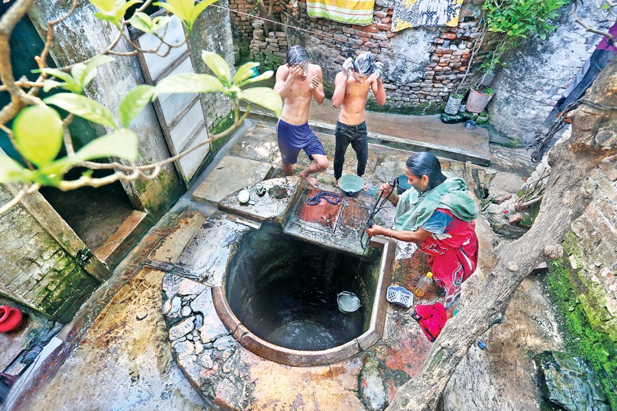 A few Old Dhaka families are still dependent on wells for water supply. The members of a family at Shyambazar are seen using such a facility as Bangladesh, along with other countries, observed the World Water Day on Friday — FE Photo by KAZ Sumon