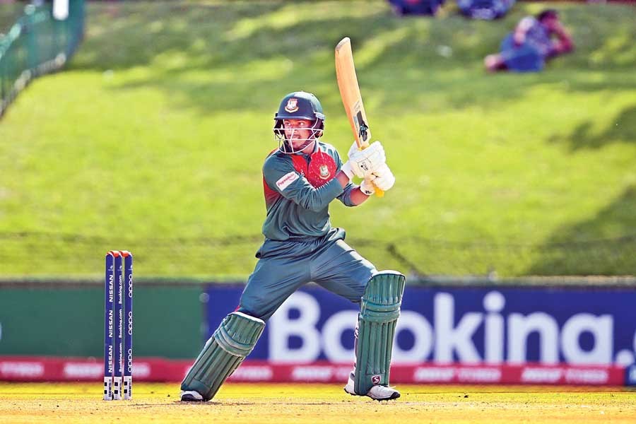 Bangladesh's U-19 batsman Mahmudul Hasan Joy cuts one away against New Zealand during the 2nd semifinal of the ICC Under-19 World Cup at Senwes Park in Potchefstroom on Thursday. He scored 100 in the match. — Internet