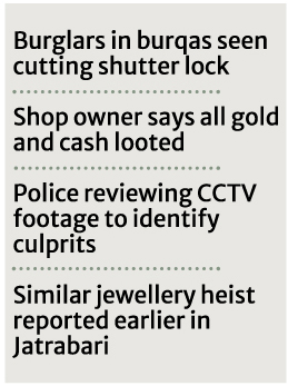 Police and local sources said the theft occurred at Shompa Jewellers around 3:00am. CCTV footage shows two burglars, disguised in burqas, cutting the shutter lock and carrying away a large amount of gold.