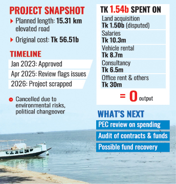 Some Tk 1.54 billion from the public exchequer has gone down the drain as the Bangladesh Bridges Authority (BBA) has cancelled the 15-kilometre elevated road project in Kishoreganj's haor area after spending the money, sources say.