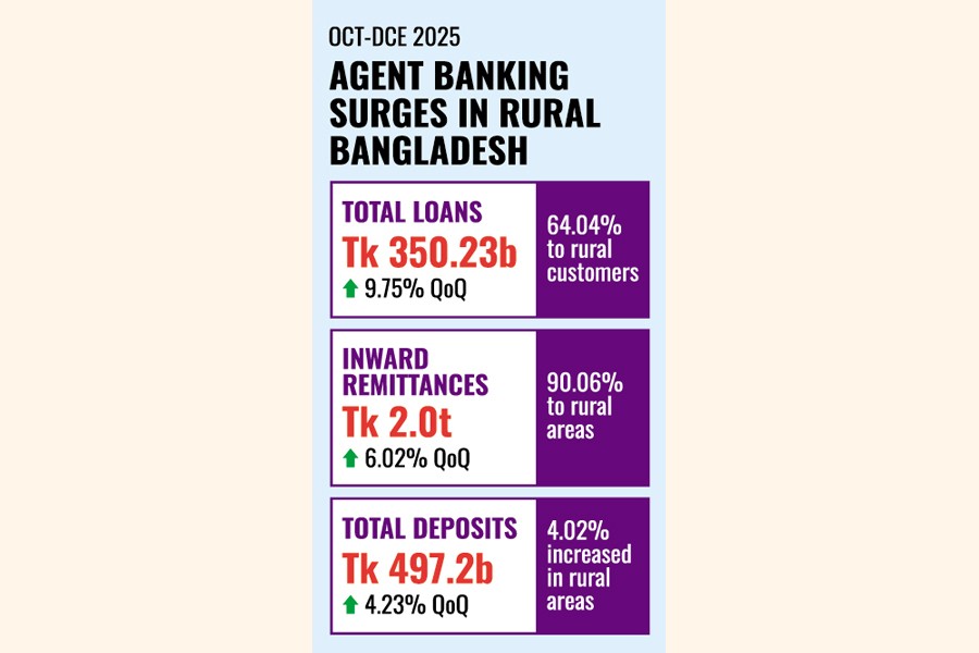 Lending through agent banking rose sharply to Tk 350.23 billion by the end of December 2025, underscoring the rapid expansion of this alternative delivery channel, particularly in rural Bangladesh.