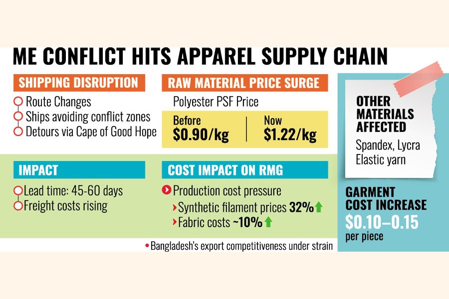 Industry insiders warn that if geopolitical tensions persist, the combined impact of higher freight costs, rising energy prices and costlier raw materials could weaken Bangladesh's textile-and apparel-export competitiveness.