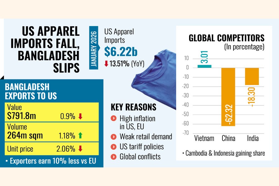 Bangladesh's apparel exports to its single-largest overseas market, the US, faced a setback in January, as America's overall garment imports dropped significantly.