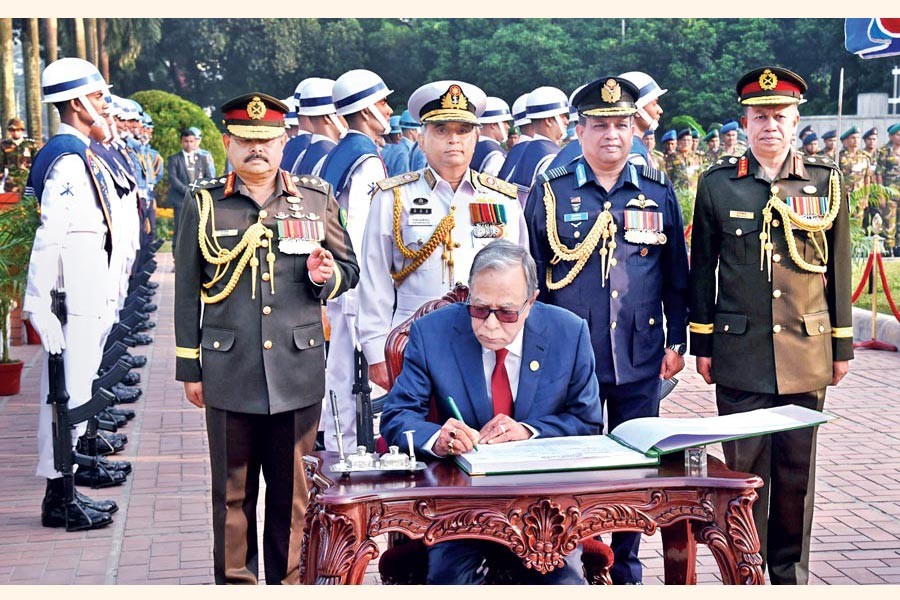 President Abdul Hamid and Prime Minister Sheikh Hasina placed wreaths at 'Shikha Anirban' (the Eternal Flame) at Dhaka Cantonment in the morning to pay homage to members of the Armed Forces who had embraced martyrdom in the War of Liberation.