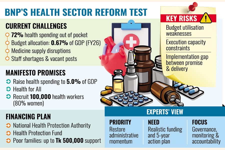 According to the BNP's election manifesto, households still bear 72 per cent of healthcare costs out of pocket, reflecting what it described as years of neglect, political interference and weak accountability.