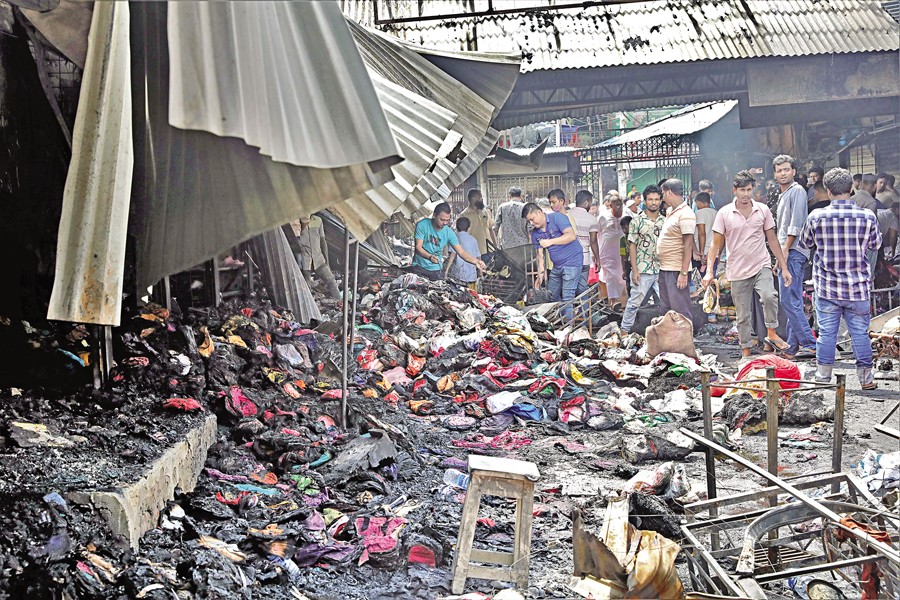 Traders scour their fire-ravaged shops at Mohammmadpur Krishi Market in the city on Friday, hoping to find anything valuable after a fire ripped through the market on Thursday. — FE photo