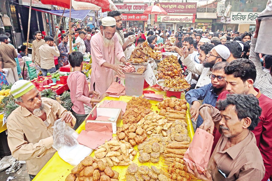 The traditional iftar market at Chawkbazar in Old Dhaka came alive on Thursday, the first day of Ramadan, with crowds filling the main road near Shahi Mosque from noon.
