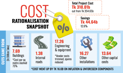 The cost of engineering and other equipment has been reduced from Tk 82.04 billion to Tk 64.78 billion, a saving of Tk 17.26 billion. This reflects the removal of certain vendor costs, a reduction in spare-parts coverage from two years to one year, and revised VAT calculations.