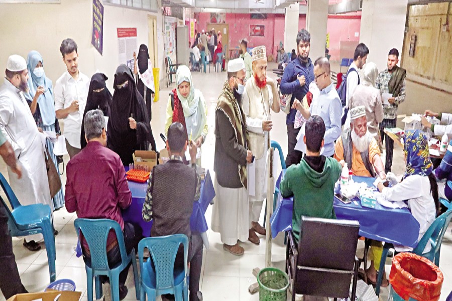 Dhaka Medical College Hospital (DMCH) dedicated the basement of the emergency department of the old building to provide medical test services for the pilgrims. On Wednesday a large number of pilgrims went there and waited hour after hour to conduct all the tests.