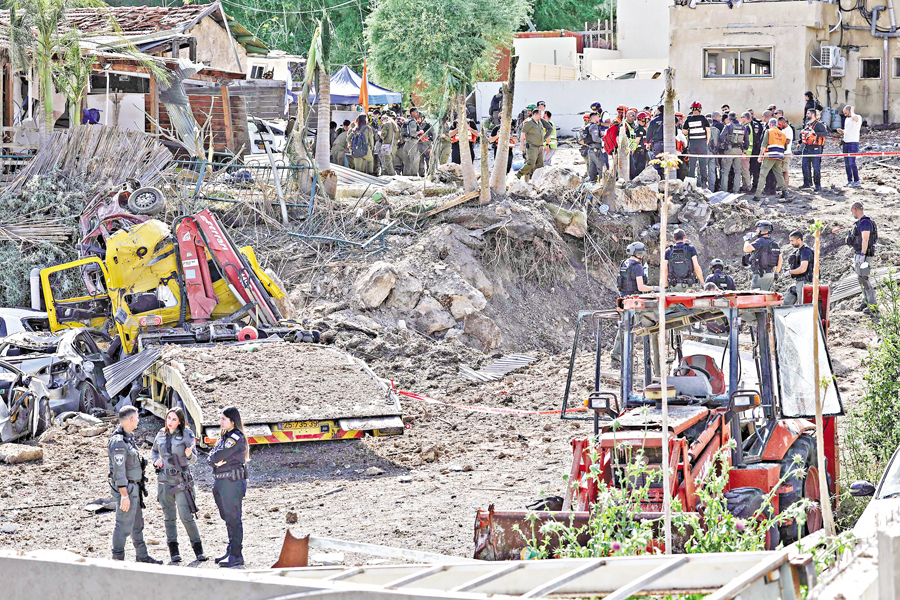 First responders and security forces work at the site of a projectile strike in Eshtaol, near Beit Shemesh in central Israel, on Saturday. — AFP