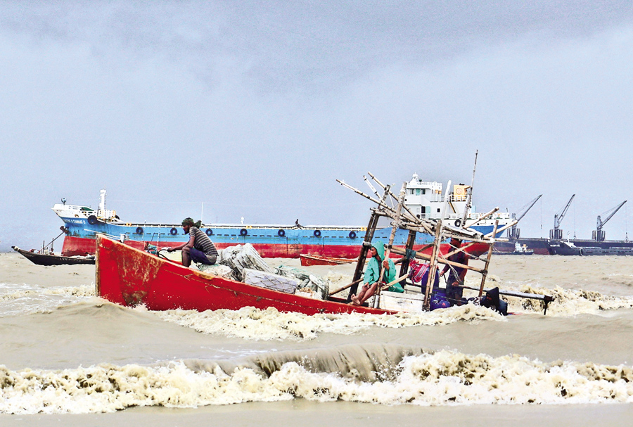 Fishing boats return to shore in Patenga Kathgarh beach area on Wednesday as the Bay of Bengal becomes