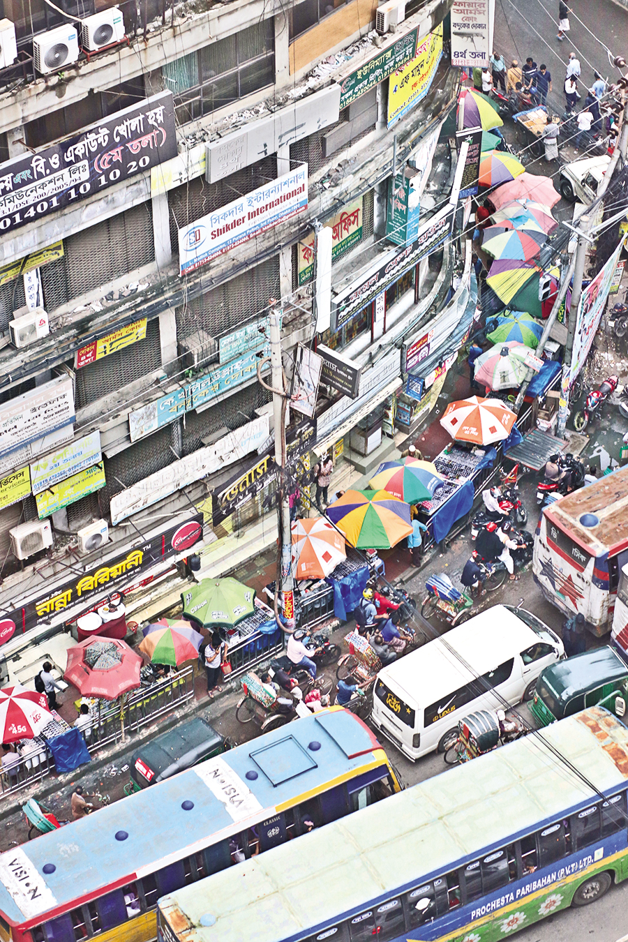 Footpath is intended for use only by pedestrians, but it is vendors who mostly occupy the pavements in many areas of the capital city. Here in this photo taken on Saturday, the footpath close to a commercial building in the bustling Purana Paltan intersection is seen dotted by large umbrellas under which street hawkers are running their trade. — FE photo by KAZ Sumon