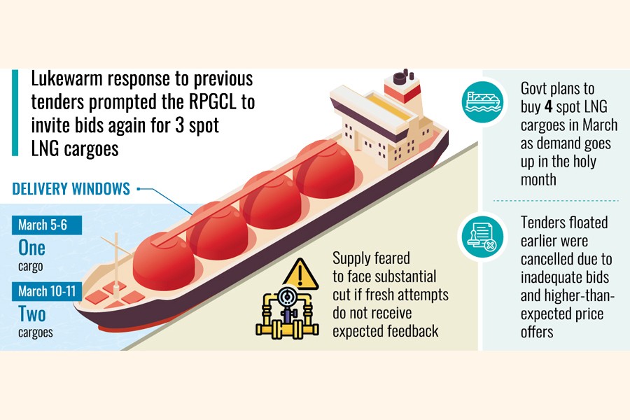State-run Rupantarita Prakritik Gas Company Ltd (RPGCL) has floated tenders again to purchase three spot liquefied natural gas (LNG) cargoes for March 05-06 and March 10-11 delivery windows.