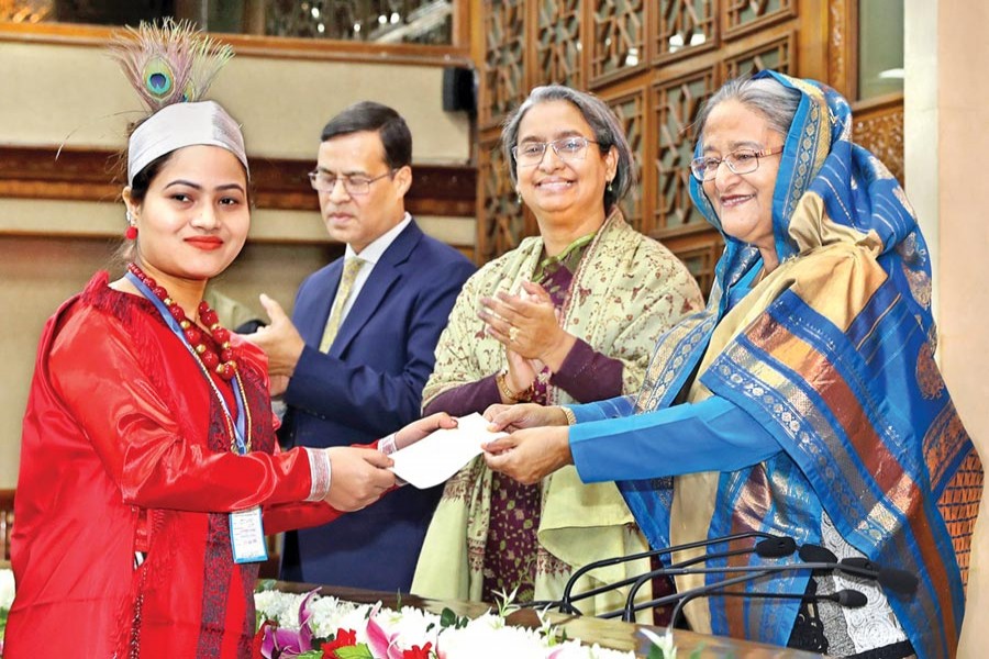 Prime Minister Sheikh Hasina handing over educational scholarship cheques to students from ethnic groups at Prime Minister's Office in the city on Thursday — BSS