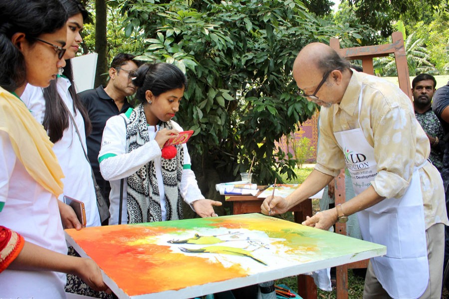 Renowned painter Hashem Khan inaugurating a painting exhibition of autistic children at the Fine Art faculty on the Dhaka University campus on Friday — Focus Bangla
