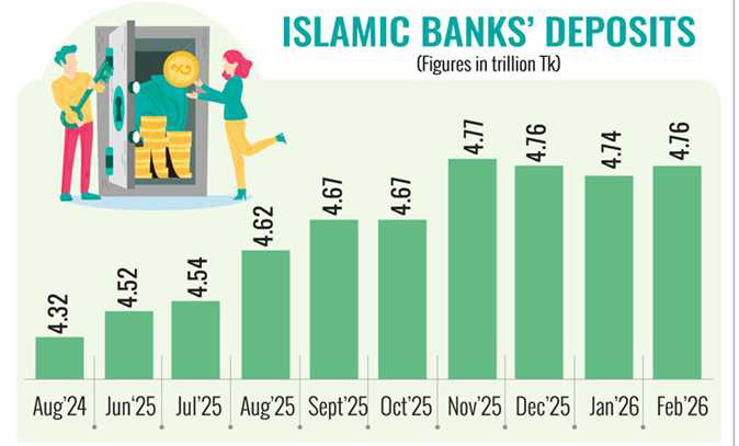 Deposits in Islamic banks remained almost unchanged at Tk 4.76 trillion in February 2026, compared to Tk 4.74 trillion in January, indicating no significant short-term growth, according to the central bank data.