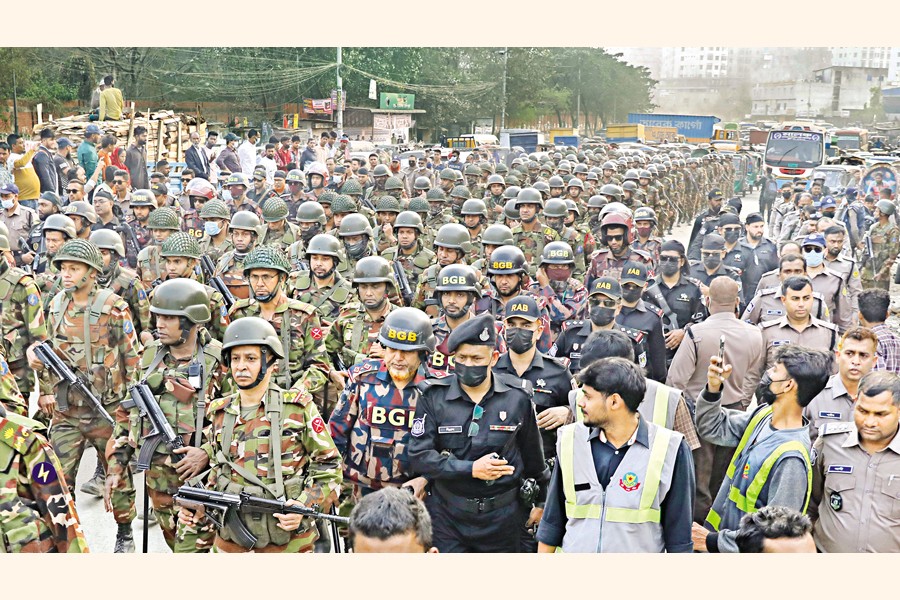 A large contingent of joint forces marches down a street in the Mohammadpur area as part of a rehearsal ahead of the 13th national elections. — FE Photo