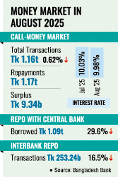 Interbank repo transactions fell by 16.51 per cent to Tk 253.24 billion, while central bank repo turnover declined by 29.6 per cent to Tk 1.09 trillion compared with July 2025.