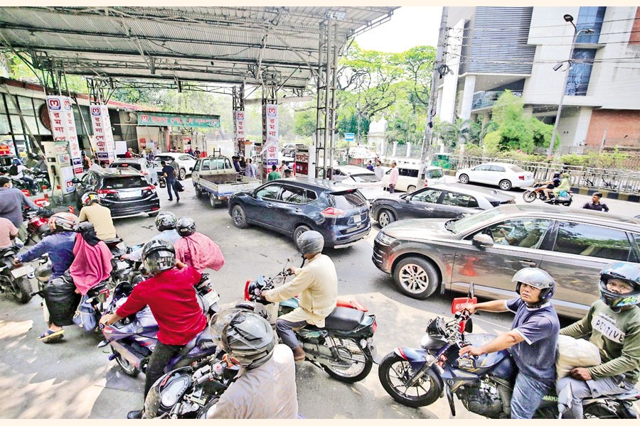 Long queues at petrol stations in the capital persist on Wednesday due to panic buying of fuel for fear of shortages amid the ongoing Middle East war. The photo was taken at Ramna filling station. — Focus Bangla