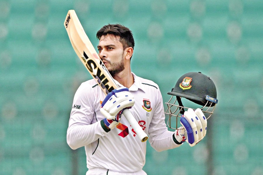 Mehidy Hasan Miraz of Bangladesh celebrates after scoring a century on the third day of the second Test against Zimbabwe at Bir Shrestha Matiur Stadium in Chattogram on Wednesday. He also took five wickets. — AFP