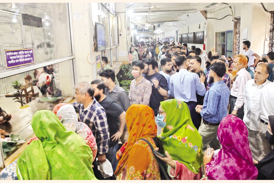 On the last banking day before Eid-ul-Fitr on Monday, customers flock in large numbers to Sonali Bank's head office in the capital's Motijheel. — FE Photo by K Asad-Uz-Zaman