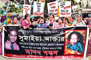A relative wailing at a human chain programme, organised in front of the National Press Club on Tuesday, demanding arrest of and punishment to the killers of Sumaiya Akter, a resident student of a madrasa at Lalbag in the capital. — FE Photo