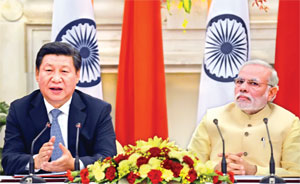 Indian Prime Minister Narendra Modi (R) looks on as Chinese President Xi Jinping (L) speaks while issuing a joint statement in New Delhi Thursday. — AFP