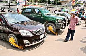 Police realised fines for illegal parking by installing wreckers to halt vehicles in front of the Bangladesh Bank head-office at Motijheel in the capital Monday. — Focus Bangla