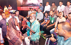 Prime Minister Sheikh Hasina talking to people affected by the \'barbaric activities\' of BNP-Jamaat last year and enquiring about their present condition at the launching ceremony of a photo-album on \'Roktakto Bangladesh\' at Osmani Memorial Auditorium